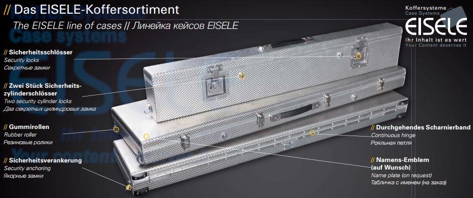 EISELE bietet also mehr als nur Standard. Obwohl schon auf einem sehr hohen Niveau verarbeitet und nur bestes Material verwendet wird, sind wir gerne bereit Ihr Koffersystem zu veredeln. Sei es durch eine besondere Lackierung (Pulverbeschichtung, Wassertransferdruck, Lasergravur, Metall-Lackierung, ...) oder durch farbige Schaumeinlagen oder gar beziehen der Schaumstoffe mit Samt, Velours oder anderen, edlen Materialien. Ein Koffer, so individuell wie Sie.