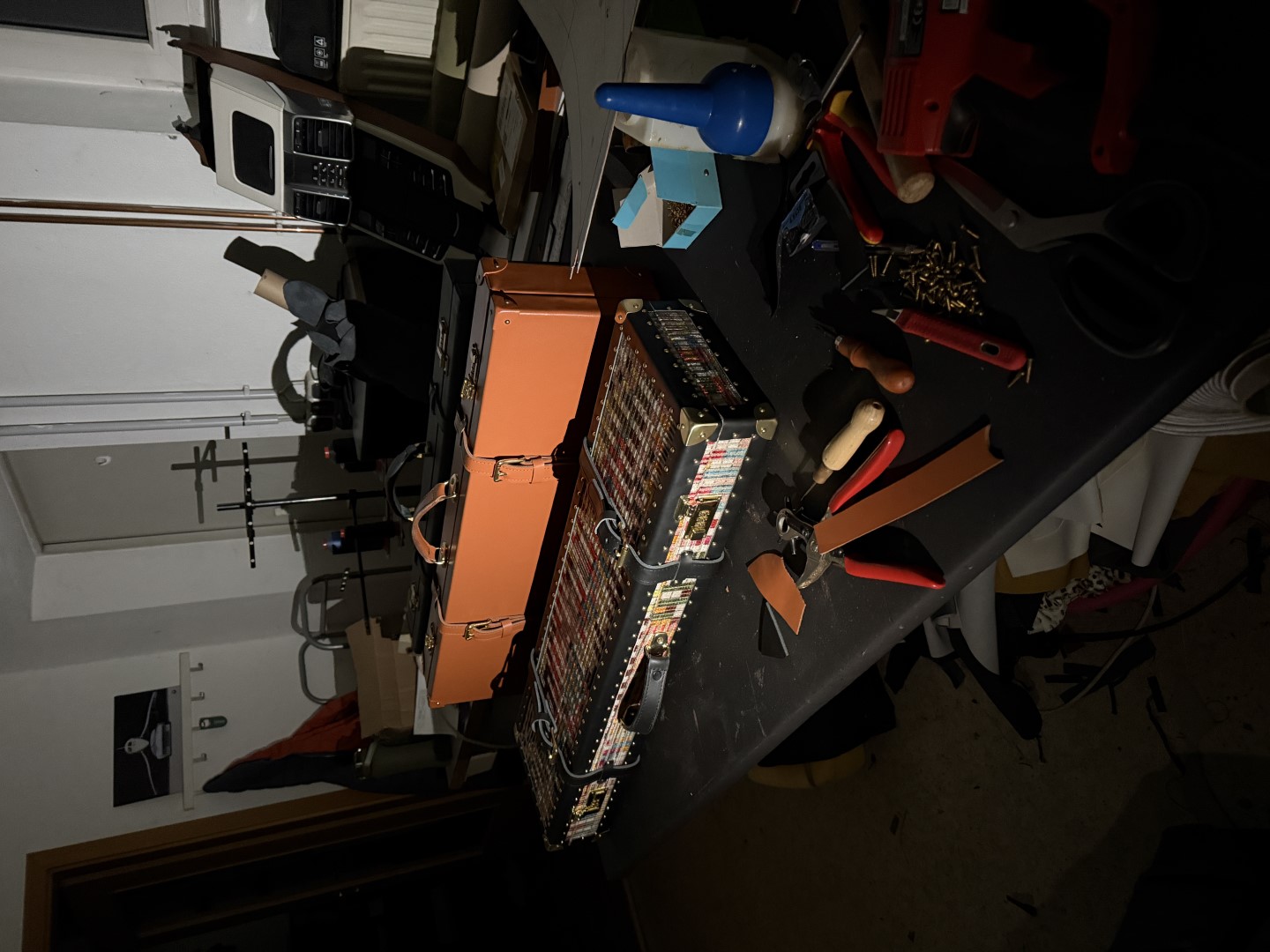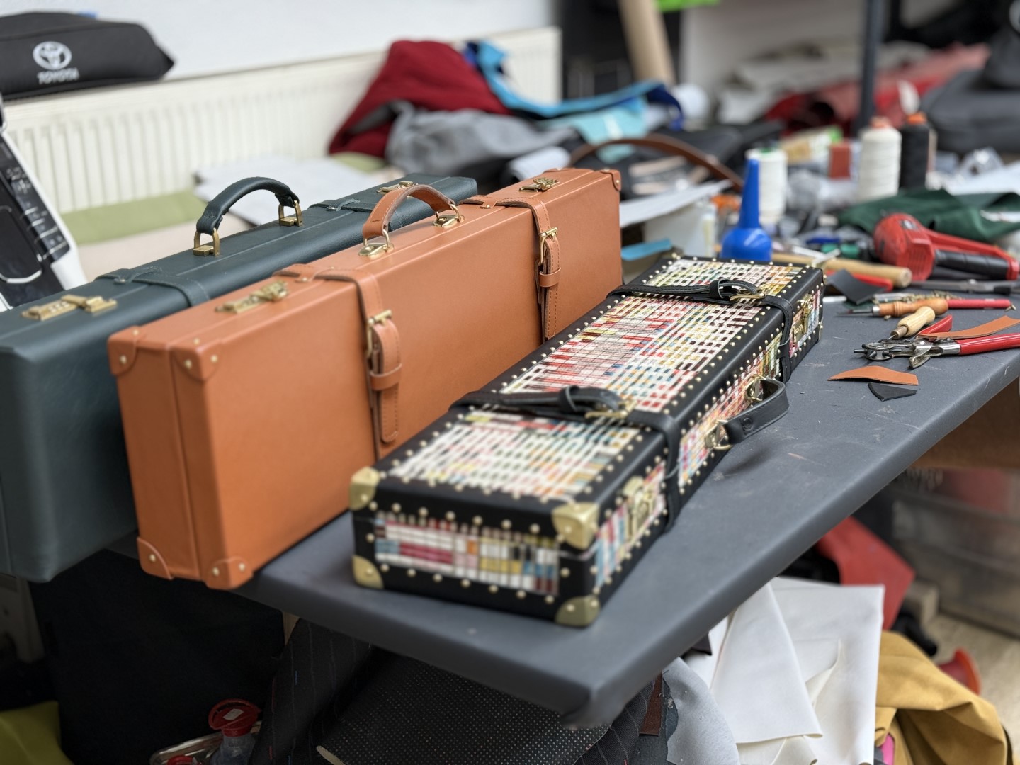 Waffenkoffer aus Leder, 100% Handarbeit, Made in Bavaria Trägerschalen aus Leichtbaukunststoff, Nut & Feder Bauweise Aussen: Leder braun-cognac, schwarz genarbt, Innen: Leichtbaukunststoff mit Velour bezogen (marineblau, rot, grün) Trennsteg, Auflagen, Zubehörfach mit Klappe Beschläge: Einbauzahlenschlösser Messing glanz/gebürstet, geschraubt Gürtelschnalle Messing glanz/gebürstet Scharniere: Messing glanz/gebürstet, geschraubt Ecken: Messing glanz/gebürstet, überzogen mit Aussenleder, genagelt Überzugtasche