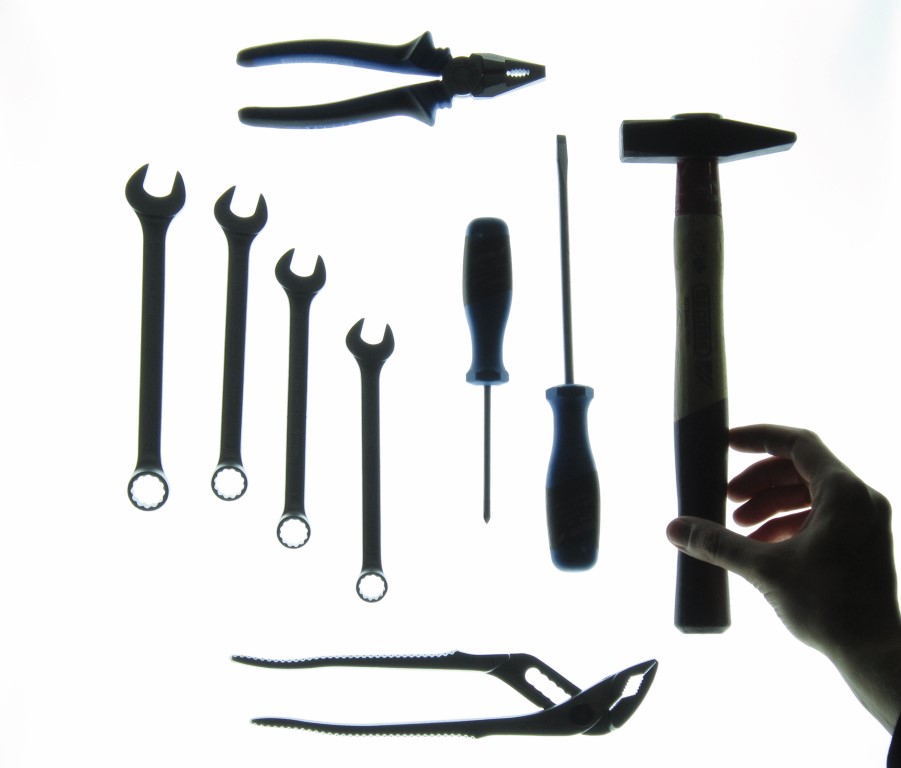 1. Sie legen Ihre Werkzeuge in der gewuenschten Anordnung auf unsere Scaneinheit. Sie erstellen ein Foto mit der mitgelieferten, kalibrierten Kamera.