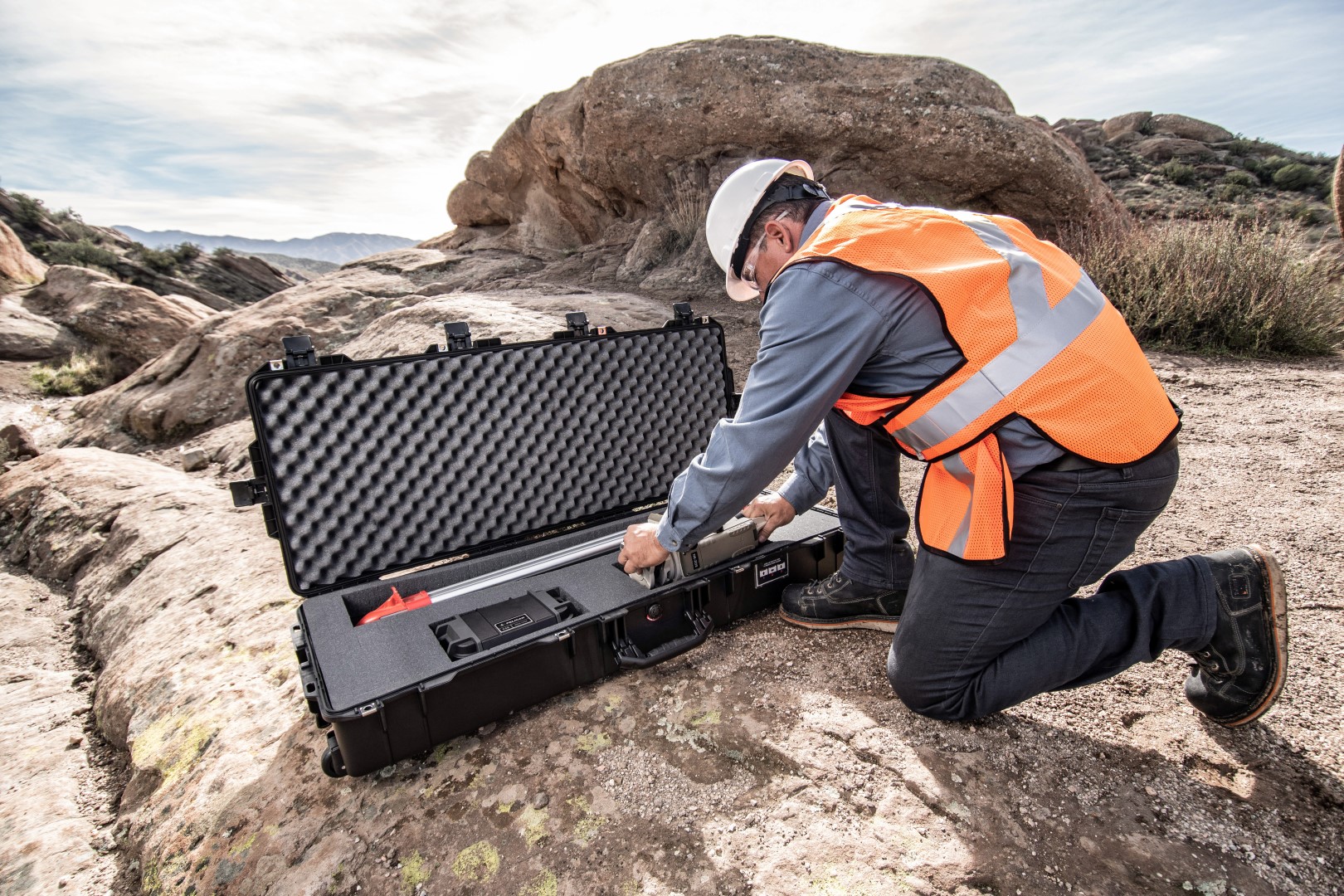 Wir haben unsere Linie von Peli™ Air-Koffern erweitert, so dass Sie jetzt Ihre langen Geräte innerhalb des härtesten und leichtesten Koffers der Welt schützen können. Mit 111,8 cm Länge und eingebauten Rollen bietet der PELI AIR 1745 den perfekten Stauraum, um Vermessungsgeräte, Stative und andere lange Geräte zu schützen.