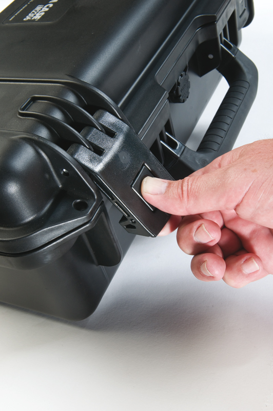 Übereinanderliegende Schloßbohrungen am Kofferrand ermöglichen das Anbringen von Schlössern, damit Ihre Ausrüstung im Koffer und Langfinger außen bleiben. Schauen Sie sich auch das TSA-geprüfte Kabelschloss von Peli an. Jetzt können Sie Ihr Gepäck sorglos aufgeben. Der Reisesicherheitsdienst hat den Schlüssel und Sie haben die Kombination.
