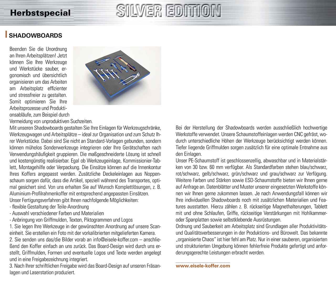 Beenden Sie die Unordnung an Ihren Arbeitsplätzen! Jetzt können Sie Ihre Werkzeuge und Werkstücke sauber, ergonomisch und übersichtlich organisieren um das Arbeiten am Arbeitsplatz effizienter und stressfreier zu gestalten. Somit optimieren Sie Ihre Arbeitsprozesse und Produktionsabläufe, zum Beispiel durch Vermeidung von unproduktiven Suchzeiten. Mit unseren Shadowboards gestalten Sie Ihre Einlagen für Werkzeugschränke, Werkzeugwagen und Arbeitsplätze – ideal zur Organisation und zum Schutz Ihrer Werkstücke. Dabei sind Sie nicht an Standard-Vorlagen gebunden, sondern können mühelos Sonderwerkzeuge integrieren oder Ihre Gerätschaften nach Verwendungshäufigkeit gruppieren. Die maßgeschneiderte Lösung ist schnell und kostengünstig realisierbar. Egal ob Werkzeugeinlage, Kommissionier-Tablett, Montagehilfe oder Verpackung. Die Einsätze können auf die Innenkontur Ihres Koffers angepasst werden. Zusätzliche Deckeleinlagen aus Noppenschaum sorgen dafür, dass die Artikel, speziell während des Transportes, optimal gesichert sind. Von uns erhalten Sie auf Wunsch Komplettlösungen, z. B. Aluminium-Profilrahmenkoffer mit entsprechend angepassten Einsätzen. Unser Fertigungsverfahren gibt Ihnen nachfolgende Möglichkeiten: