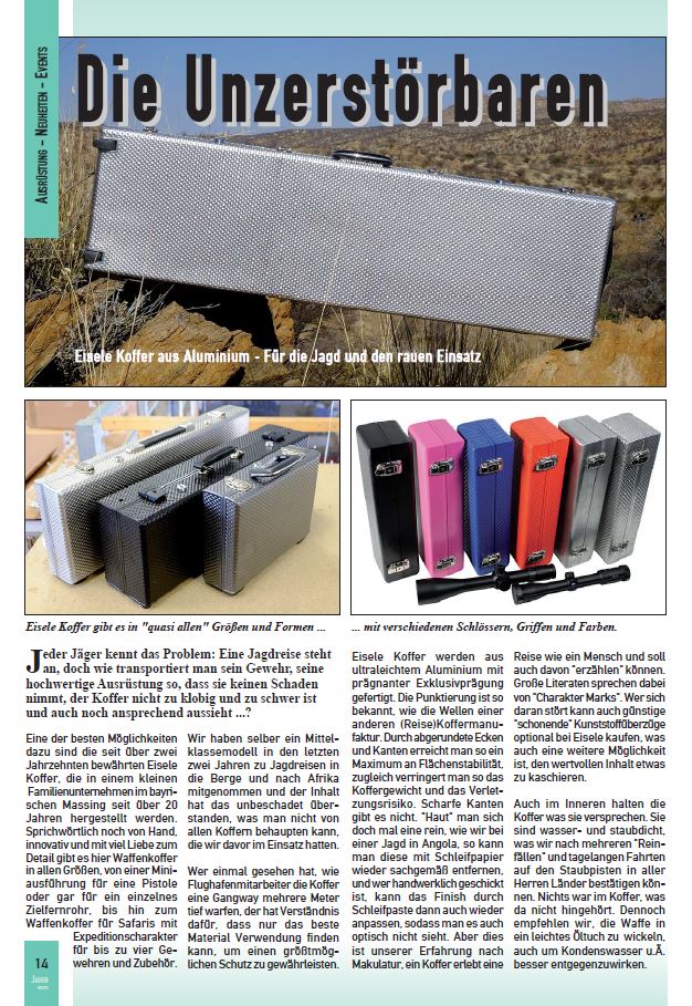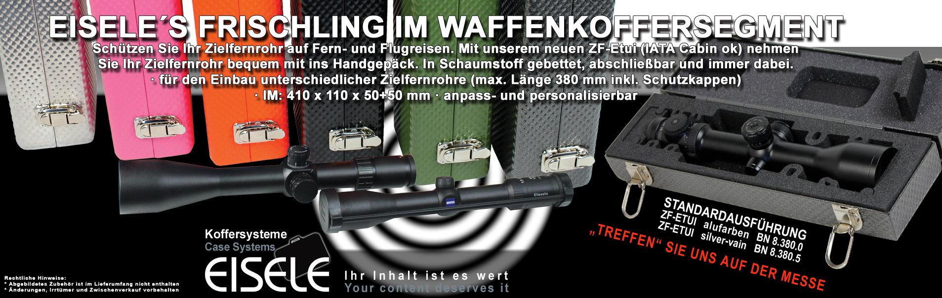 Eine der besten Möglichkeiten dazu sind die seit über zwei Jahrzehnten bewährten Eisele Koffer, die in einem kleinem Familienunternehmen im bayrischen Massing seit über 20 Jahren hergestellt werden. Sprichwörtlich noch von Hand, innovativ und mit viel Liebe zum Detail gibt es hier Waffenkoffer in allen Größen, von einer Mini-Ausführung für eine Pistole oder gar für ein einzelnes Zielfernrohr, bis hin zum Waffenkoffer für Safaris mit Expeditionscharakter für bis zu vier Gewehren und Zubehör.