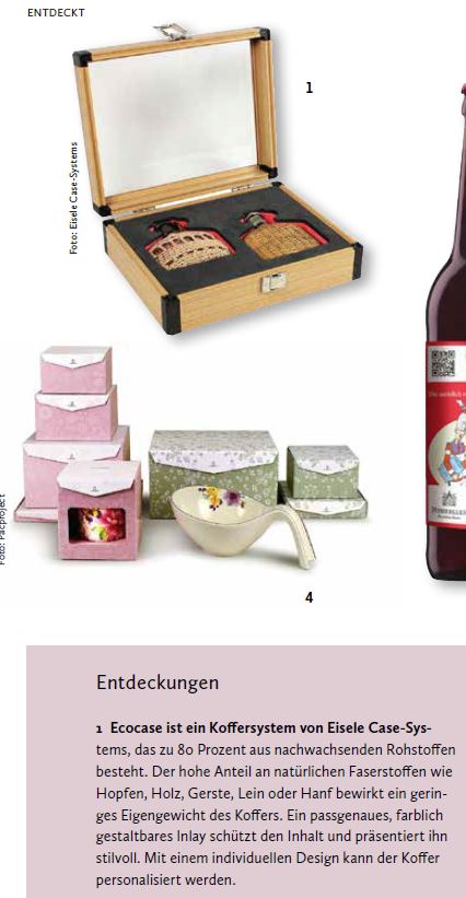 ECOcase ist ein Koffersystem von EISELE Case-Systems, das zu 80 Prozent aus nachwachsenden Rohstoffen besteht. Der hohe Anteil an natürlichen Faserstoffen wie Hopfen, Holz, Gerste, Lein oder Hanf bewirkt ein geringes Eigengewicht des Koffers. Ein passgenaues, farblich gestaltbares Inlay schützt den Inhalt und präsentiert ihn stilvoll. Mit einem individuellen Design kann der Koffer personalisiert werden